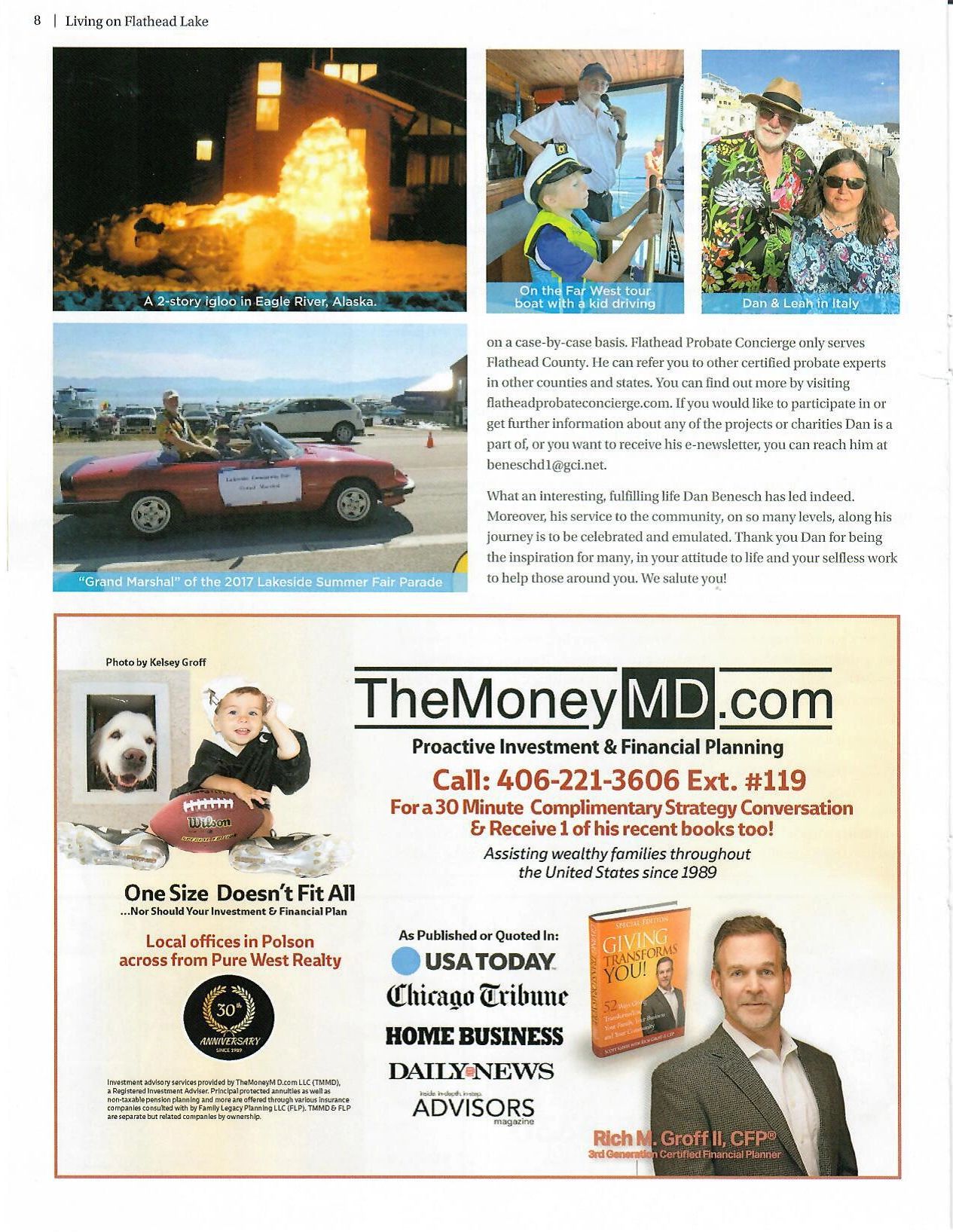 I am a 14-year resident of Flathead County. It was my privilege to play a pivotal role in creating the Lakeside Community Garden, spearhead the Lakeside/Somers Mural Project, and lead the charge to keep the green-box dump site in Lakeside Somers, and Bigfork. I publish a local e-newsletter that reaches over 500 of the most influential people on the west shore of Flathead Lake. A few years ago I was honored to be awarded the position of "Grand Marshal" of the Lakeside 4th of July Parade in recognition of my community service and charitable contributions. I enjoy gardening, real estate investing, and world traveling.